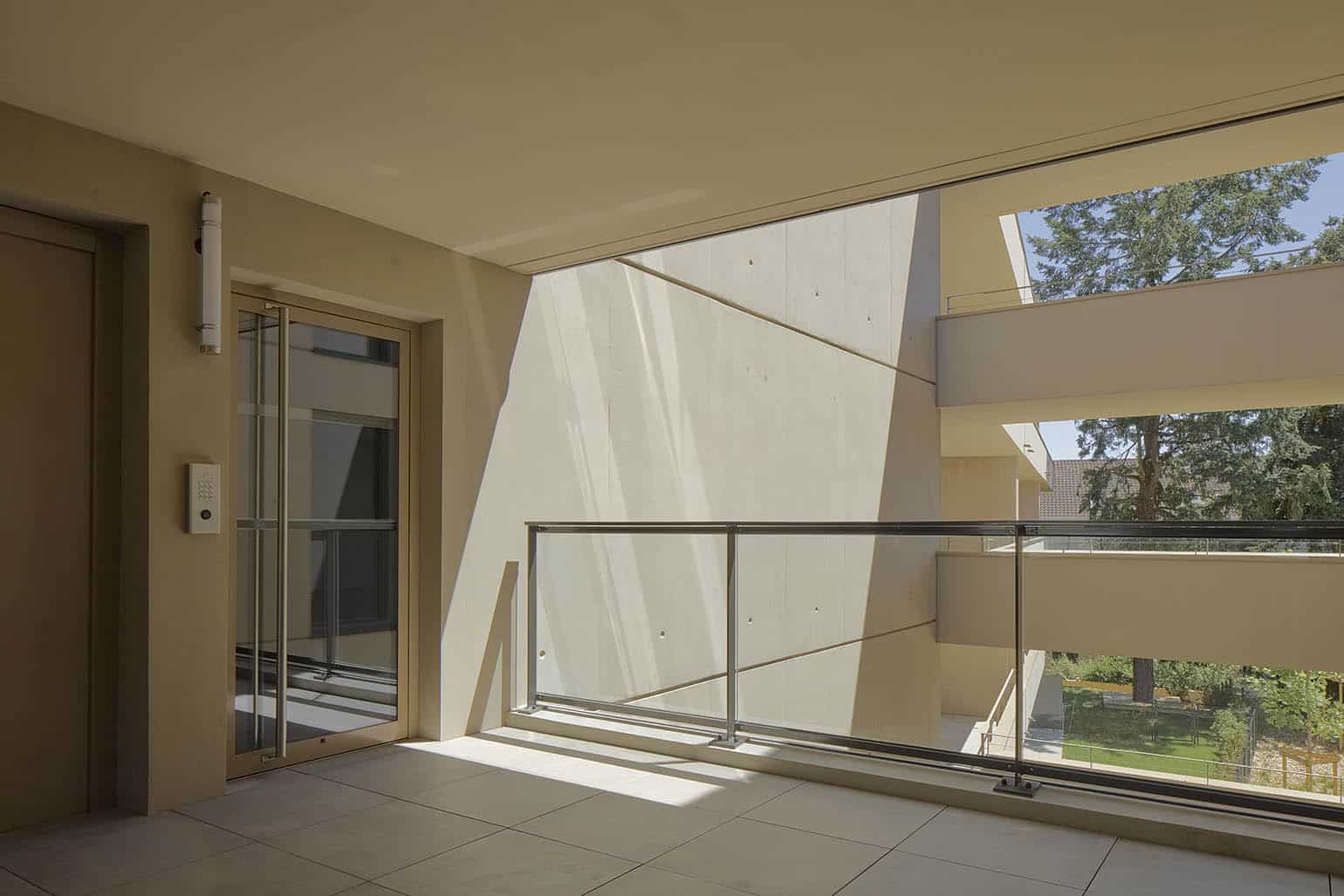 L’orientation sud, sud-ouest offre une clarté solaire aux larges terrasses et balcons en bandeaux. Les deux halls soutiennent un empilement de paliers ouverts, à la fois traits d’union entre les bâtiments et arches modernes accueillant élégamment les résidents dans ce bel écrin.