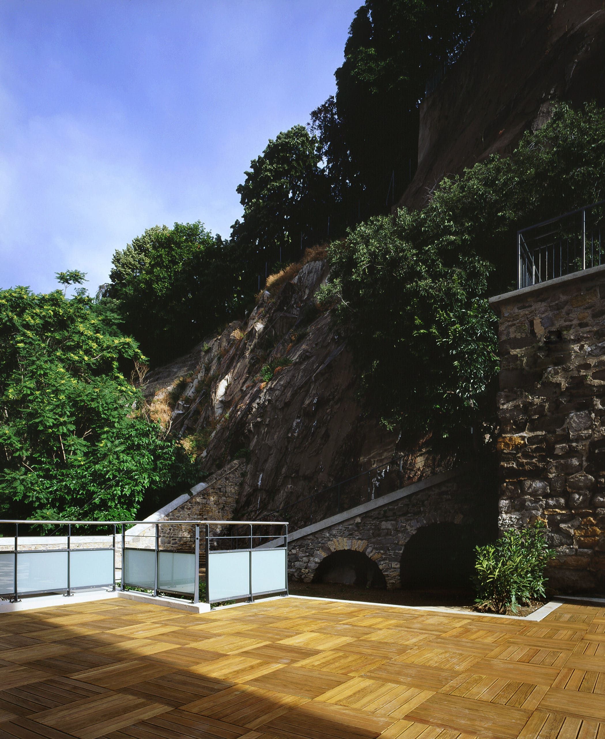 “Nous avons cherché tout d’abord à connaître l’histoire du site, sa structure urbaine, son identité, afin de pouvoir définir un principe architectural qui allie histoire et modernité. Le terrain est aujourd’hui occupé par un ancien garage. Cet ensemble sans intérêt patrimonial est amené à être démoli. Le parti architectural consiste à s’intégrer dans le site par un bâtiment en proue faisant front de quai, et allant se fondre dans la colline, accentuant ainsi l’effet de terrasses.
