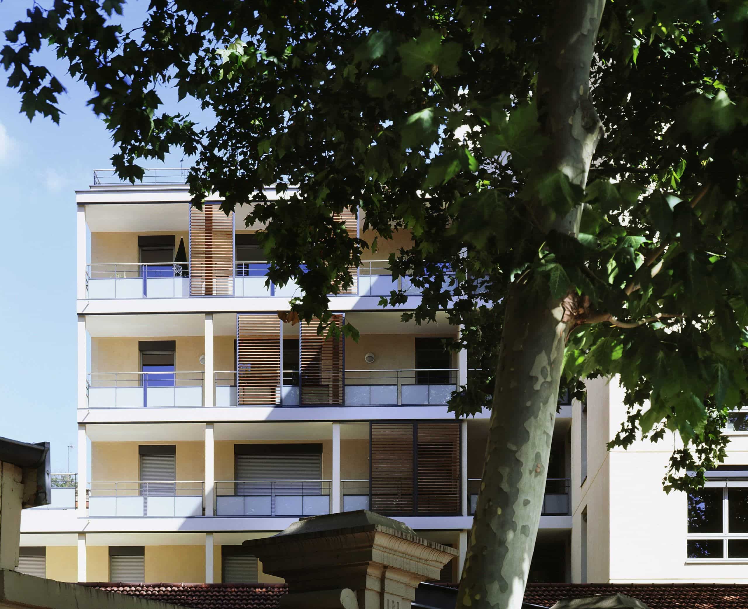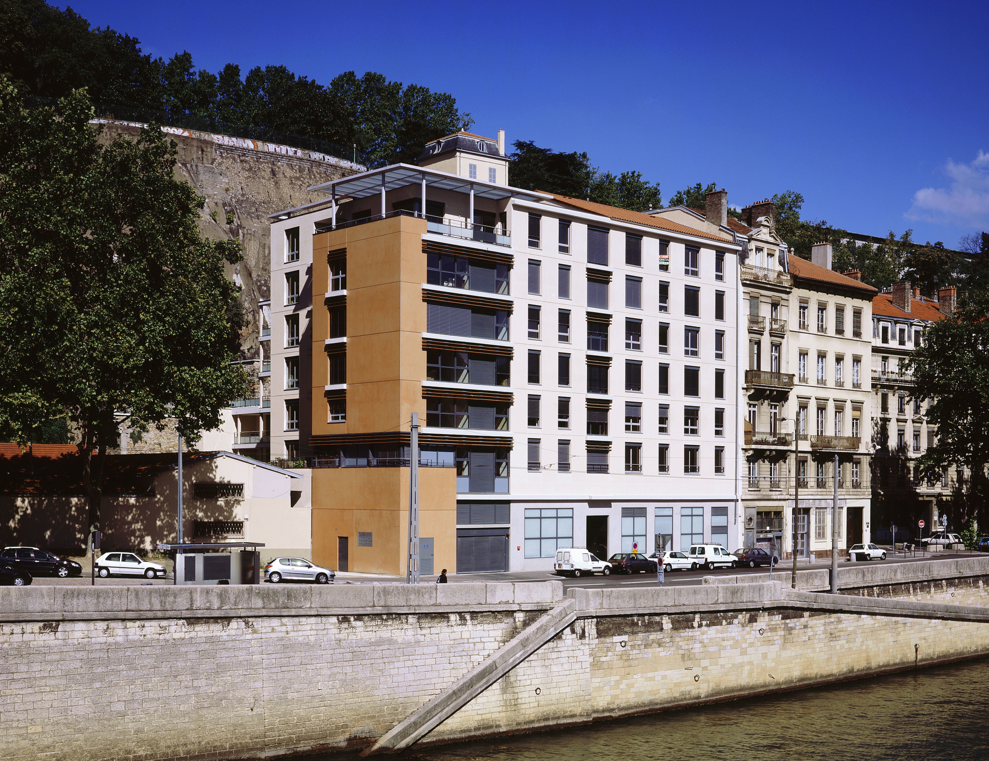 L’architecture, classique dans sa composition, est contemporaine dans son expression et ses matériaux. Les larges ouvertures au Sud sur la Saône mettent Rive Saint Vincent en relation avec le paysage fluvial du quai, et avec la colline arborée d’en face (Fourvière). La toiture venant se raccrocher au bâtiment mitoyen à l’Est est traitée en tuiles et en terrasse. A l’Ouest, cette terrasse est végétalisée afin de se composer avec le paysage environnant.